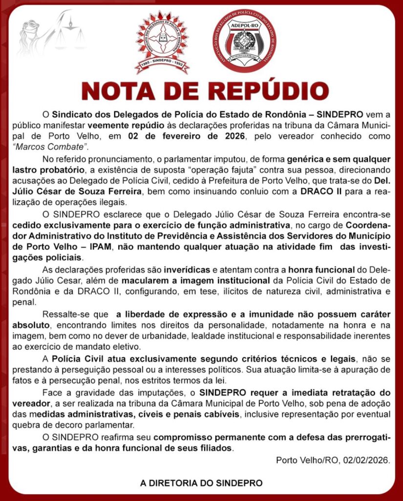 Aparentemente Marcos Combate se irritou com a apresentação da denúncia do MP e resolveu dar uma de doido, partindo para cima da Polícia e do delegado Júlio César. O Sindicato dos Delegados divulgou uma nota dura, dizendo que Júlio César não está investigando o vereador, pois exerce função administrativa no Ipam, na prefeitura de Porto Velho.
