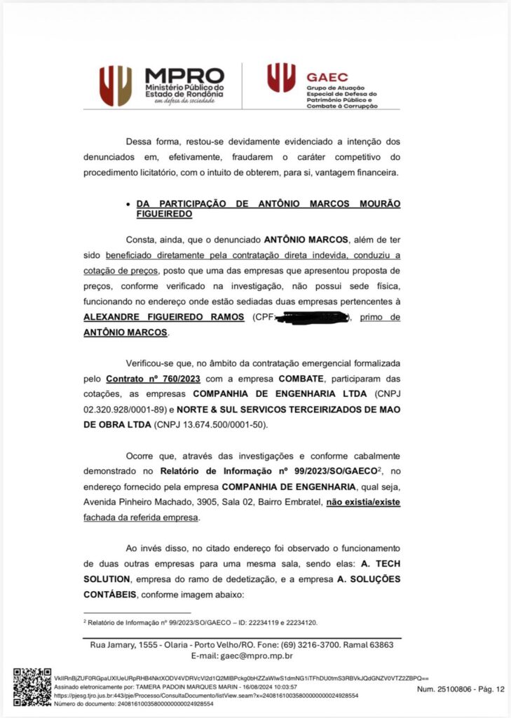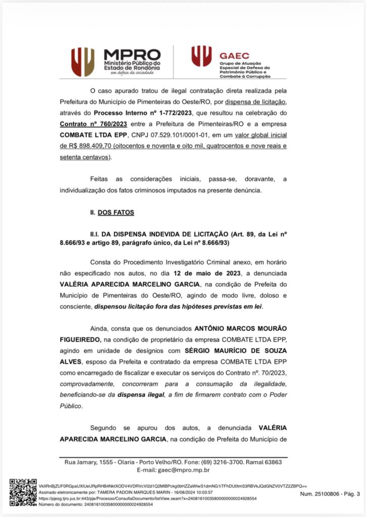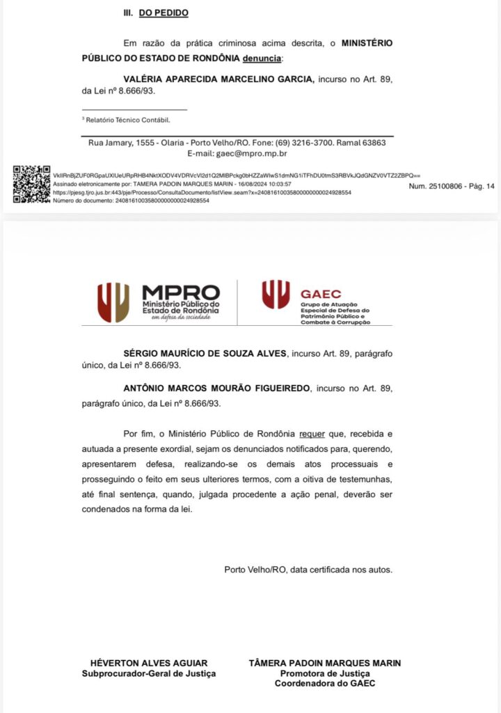 O Ministério Público do Estado pediu a condenação do vereador de Porto Velho, Marcos Combate (Agir); da prefeita de Pimenteiras do Oeste, Valéria Garcia (União Brasil); e ainda do marido da prefeita, Sérgio Alves. Os três teriam fraudado licitação no valor de R$ 1,1 milhão para a execução de serviços terceirizados na prefeitura.
