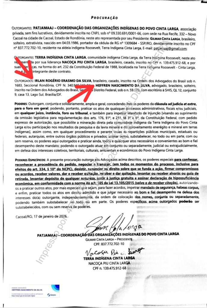 Enquanto isso, o advogado Marcio Welder, que obteve a decisão favorável para a exploração de diamantes, assinou contrato com a Cooperativa de Produção e Desenvolvimento do Povo Cinta Larga RO/MT (Cooperbravo).
