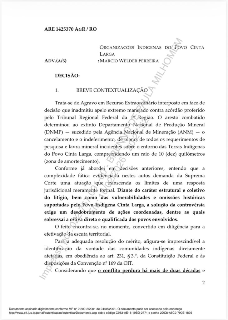 O ministro do Supremo Tribunal Federal (STF), Flávio Dino, emitiu nova decisão sobre a garimpagem de diamantes na Terra Indígena Cinta Larga, que abrange Rondônia e parte do Mato Grosso.