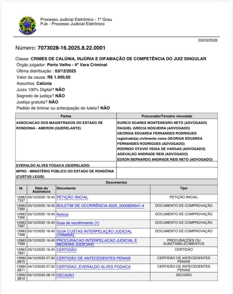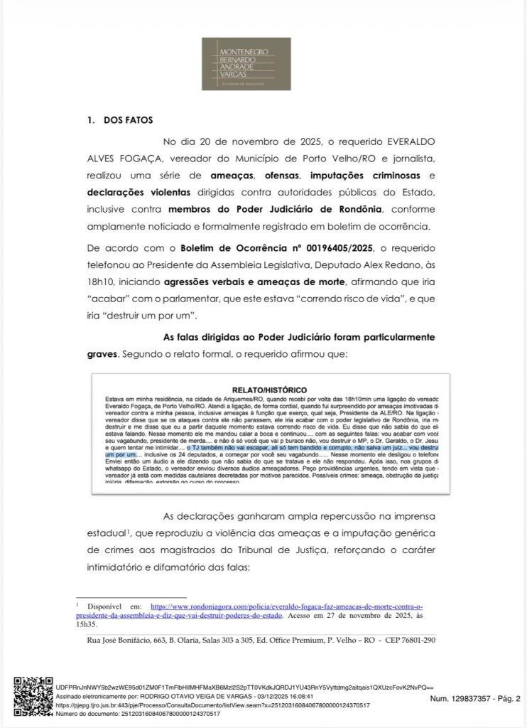 Na ação, a Ameron detalha que, em 20 de novembro de 2025, o vereador Everaldo Fogaça “realizou uma série de ameaças, ofensas, imputações criminosas e declarações violentas dirigidas contra autoridades públicas do Estado, inclusive contra membros do Poder Judiciário”.