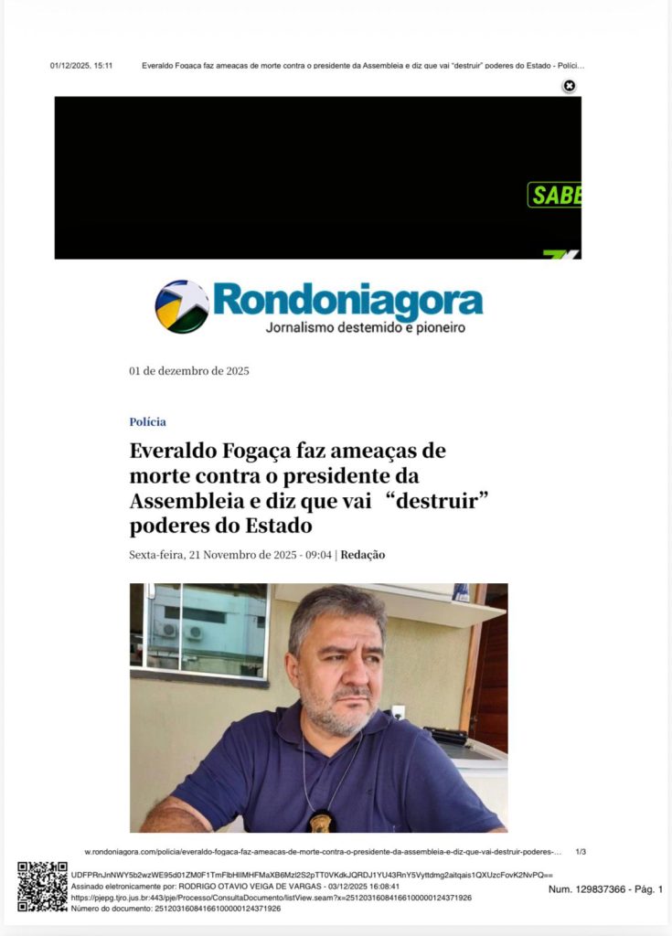 Na petição, dentre outras coisas, foi anexado print de postagem de matéria do site Rondoniagora narrando os ataques de Everaldo Fogaça ao Judiciário e as ameaças ao presidente da Assembleia Legislativa.