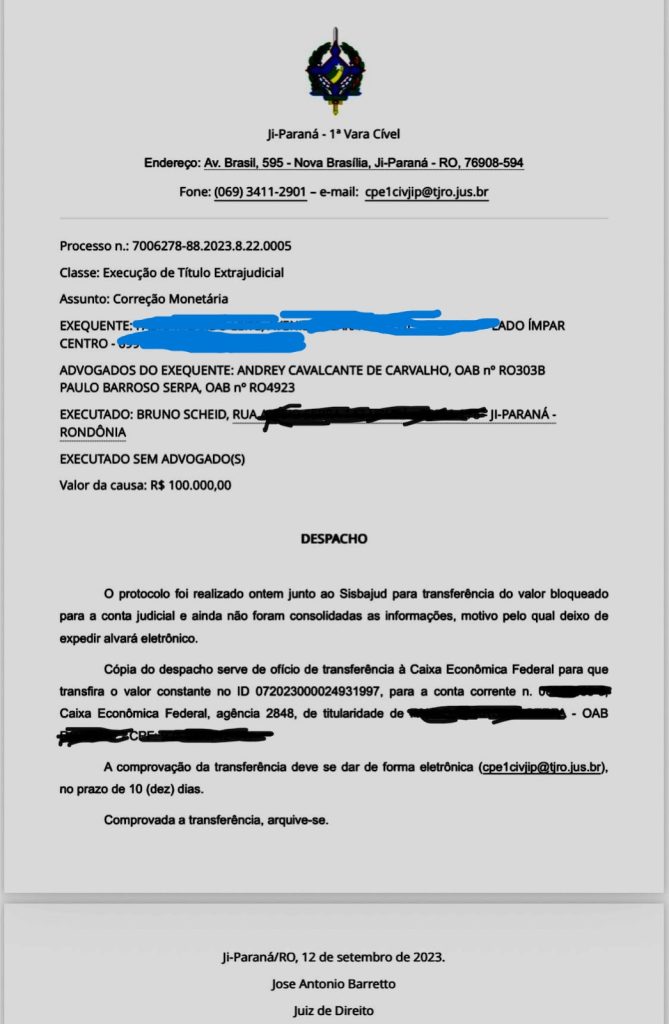 As peripécias de Bruninho não param por aí. E também não dá para dizer que ele nunca paga. Algumas vezes ele paga, sim. Teve o caso de um empréstimo de R$ 100 mil que ele pagou, mas somente depois que o dinheiro foi bloqueado em sua conta corrente. Tem print da decisão judicial.