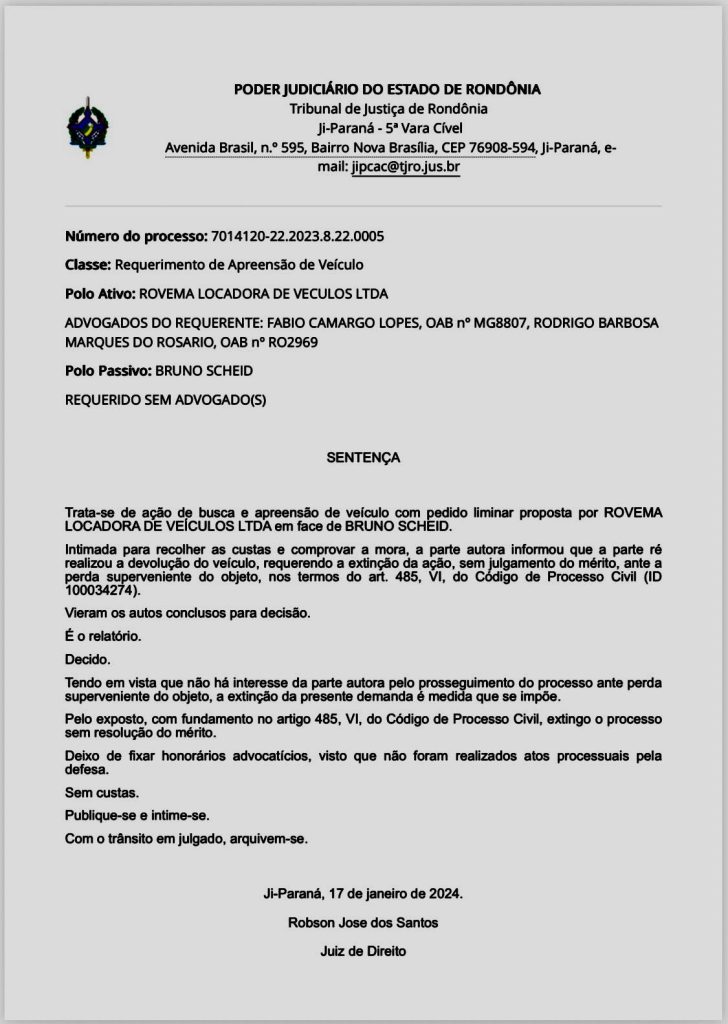 No caso, o segundo processo acabou arquivado a pedido da própria locadora, pois ao ser informado da ação judicial Bruno Scheid resolveu devolver o carro alugado.