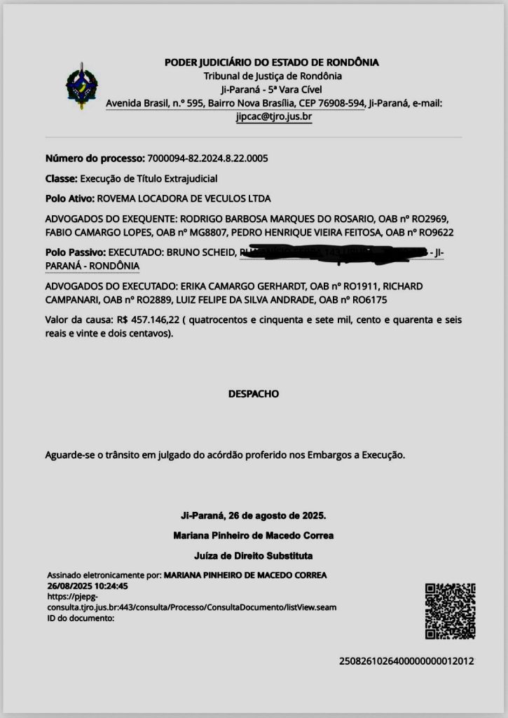 Cópias de processos judiciais e outros documentos que chegaram ao blog Entrelinhas mostram que o “pecuarista” Bruno Scheid tem dificuldade para pagar suas contas. Chama a atenção o caso de uma locadora que foi obrigada a acionar a Justiça duas vezes, uma para receber R$ 457.146,22 e outra para conseguir recuperar o veículo.