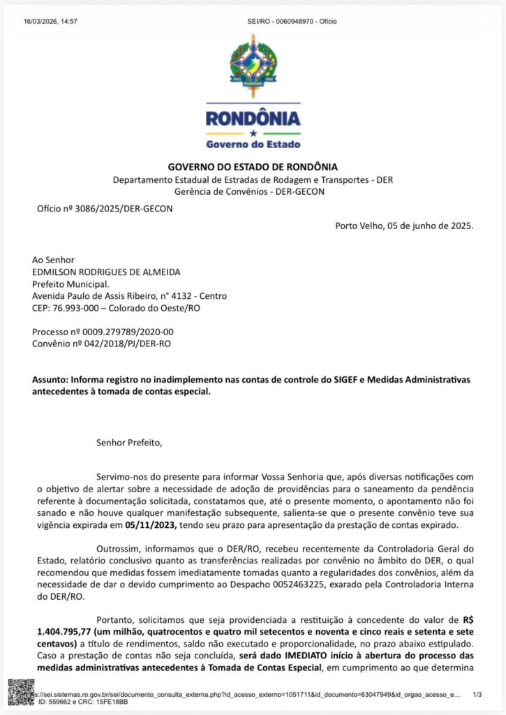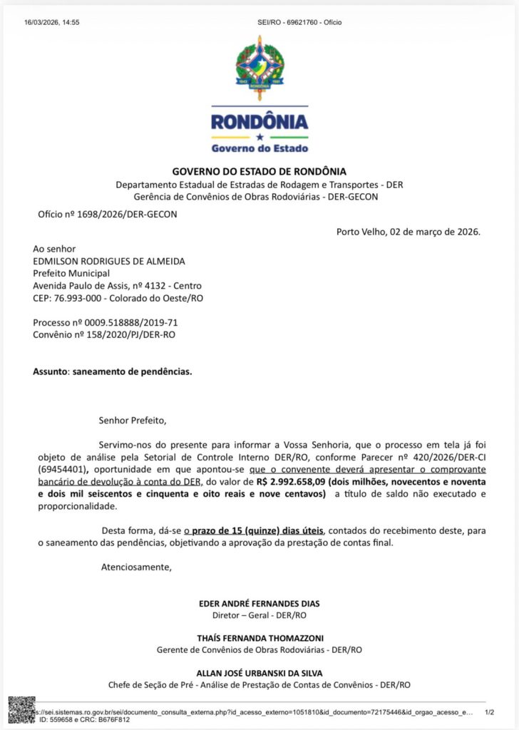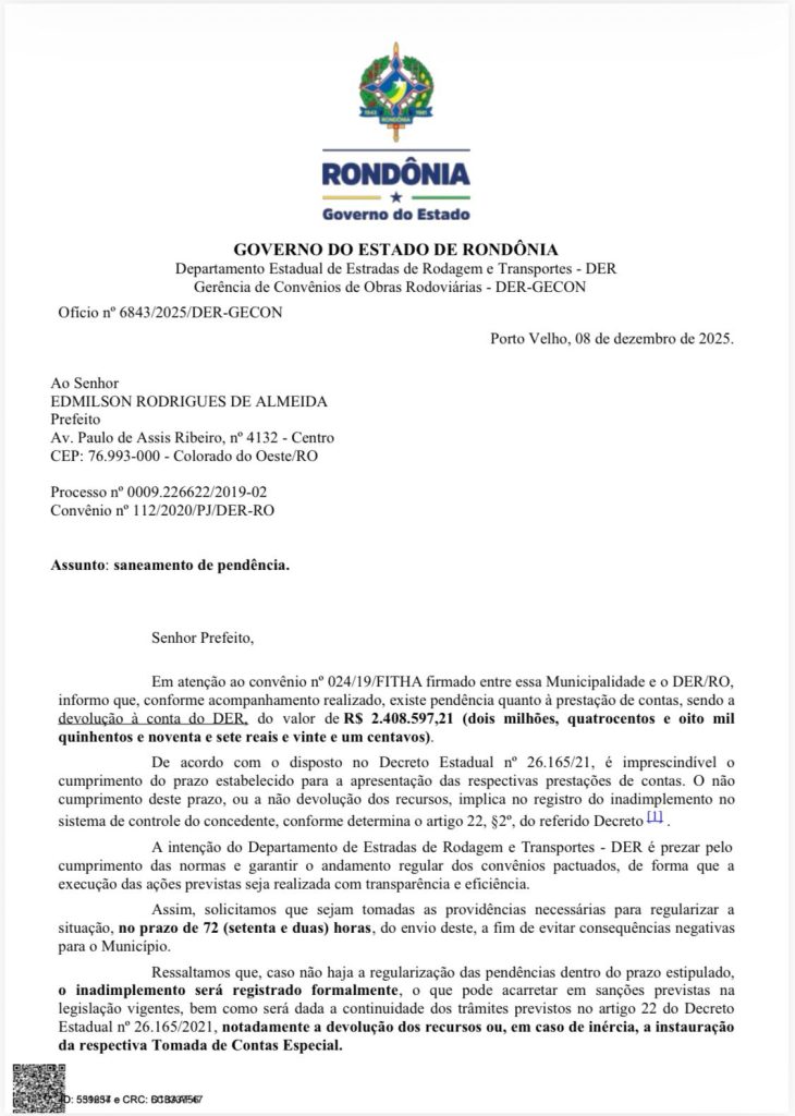 Os ofícios encaminhados pela prefeitura de Colorado do Oeste à Câmara de Vereadores são claros: o DER está cobrando a devolução do dinheiro aplicado. São cerca de R$ 10 milhões. O blog Entrelinhas posta alguns desses ofícios. São diversos.
