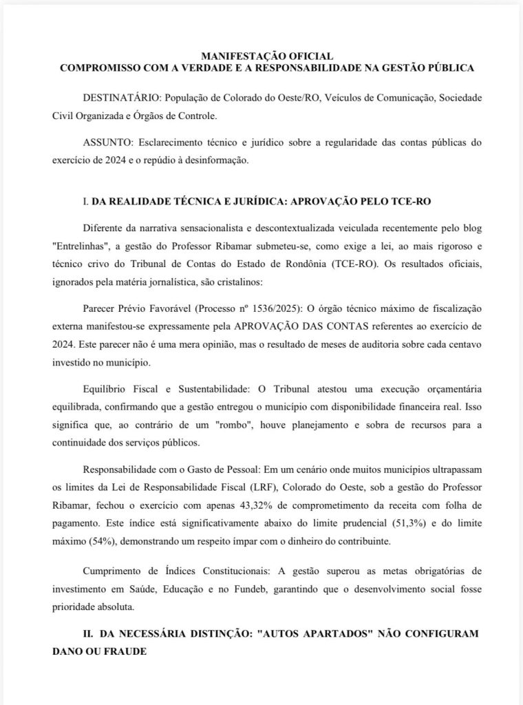 O ex-prefeito de Colorado do Oeste, conhecido como Professor Ribamar, tenta dar uma de João sem braço no caso do desaparecimento de R$ 10 milhões repassados ao município pelo DER. As obras não foram executadas, o departamento quer os recursos de volta, mas o dinheiro aparentemente sumiu.