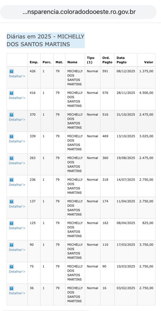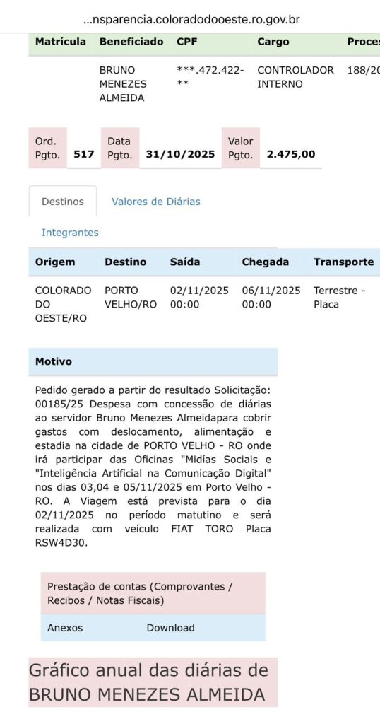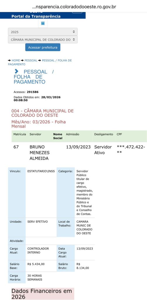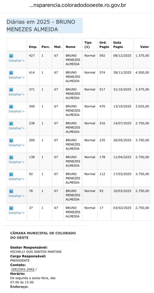O controlador Bruno é funcionário efetivo e recebe R$ 8.134,00 por mês, valor que aumenta ao ser nutrido pelas diárias. Observem o print obtido no portal da transparência da prefeitura de Colorado.