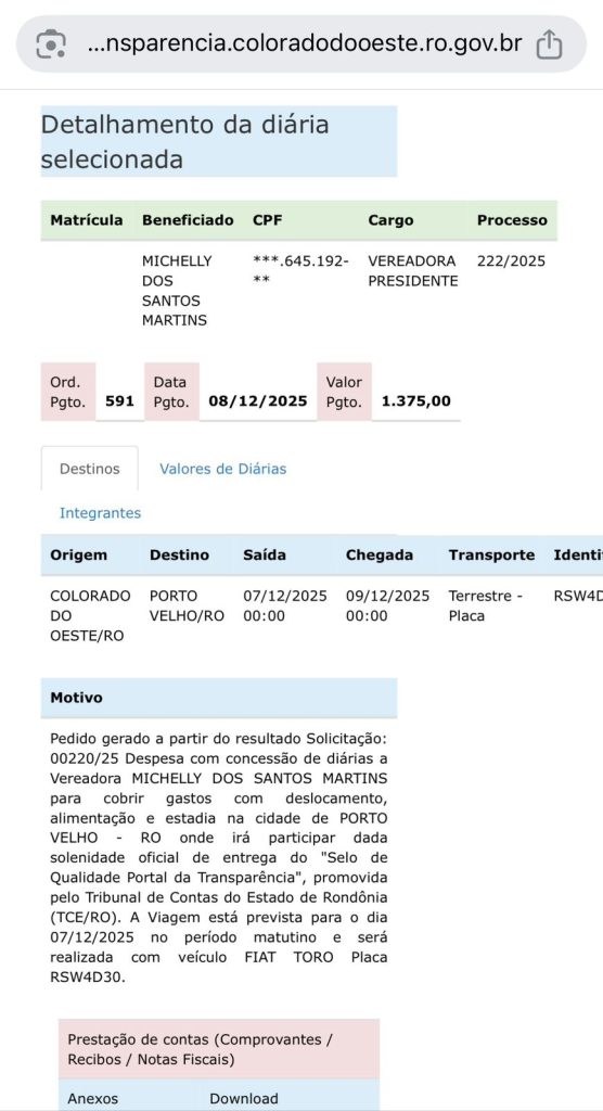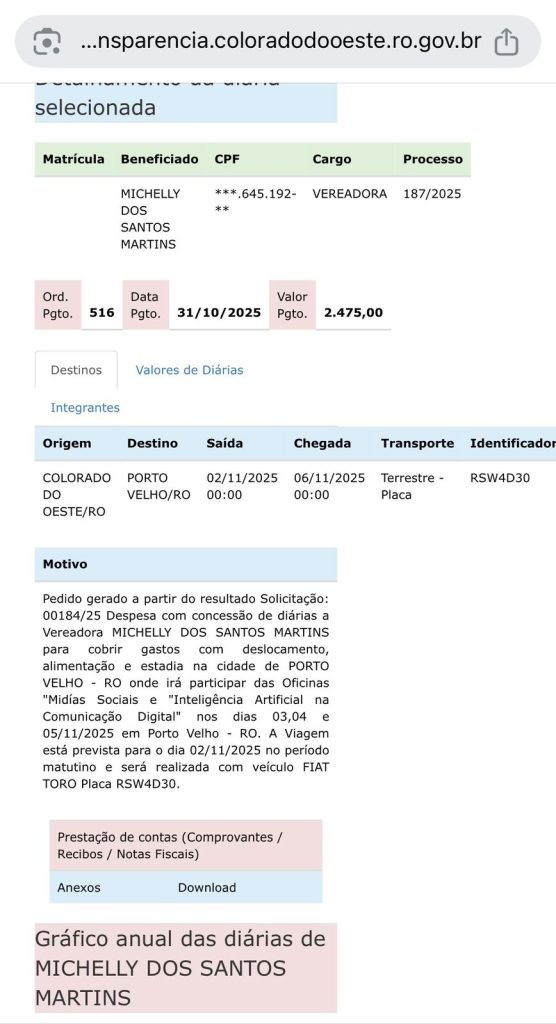 Agora vamos falar das viagens custeadas com dinheiro público. Inicialmente observem o print das diárias da presidente da Câmara, a vereadora Michelly.