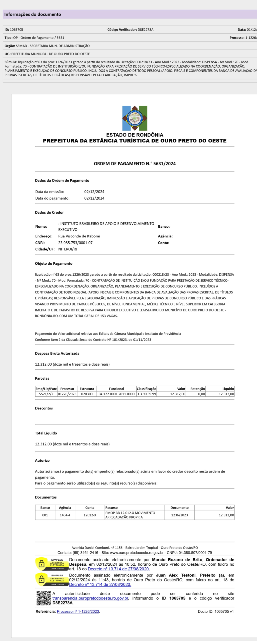 Sabe quem assina a ordem de pagamento para o instituto que promoveu o concurso? Ele mesmo, é claro, Marcio Rozano. Olhe a ordem de pagamento assinada pelo irmão do senador.