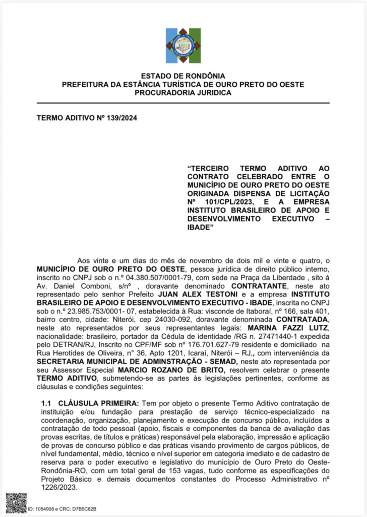 Como secretário de Administração Municipal em Ouro Preto do Oeste, Marcio Rozano, o irmão, contratou um instituto do Rio de Janeiro para promover um concurso público para a prefeitura. Até aí, tudo bem. Mas olhe o aditivo do contrato, tem o nome da secretaria de Rozano.