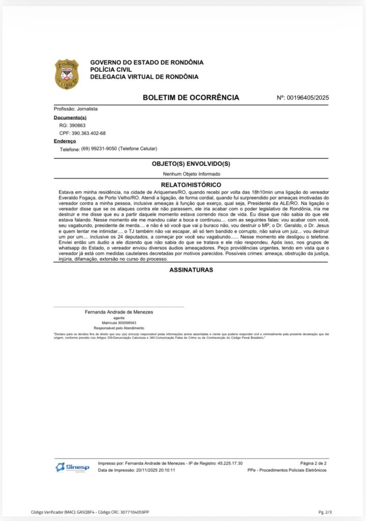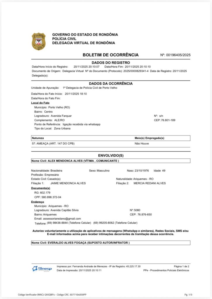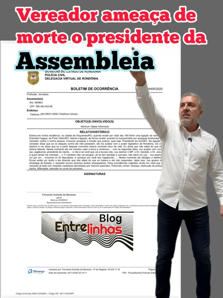 “Na ligação o vereador disse que se os ataques contra ele não parassem, ele iria acabar com o poder legislativo de Rondônia, iria me destruir e me disse que eu a partir daquele momento estava correndo risco de vida. Eu disse que não sabia do que ele estava falando. Nesse momento ele me mandou calar a boca e continuou…. com as seguintes falas: vou acabar com você, seu vagabundo, presidente de merda…. e não é só você que vai p buraco não, vou destruir o MP, o Dr. Geraldo, o Dr. Jesus e quem tentar me intimidar…. o TJ também não vai escapar, ali só tem bandido e corrupto, não salva um juiz… vou destruir um por um…. inclusive os 24 deputados, a começar por você seu vagabundo…… Nesse momento ele desligou o telefone”, citou Alex Redano no boletim de ocorrência.